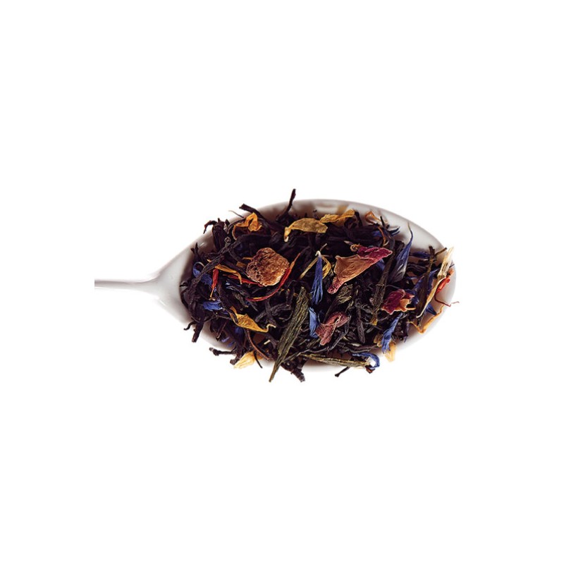 Thé noir, thé vert, écorces d'orange, pétales de bleuet, pétales de rose, pétales de souci, pétales de carthame.